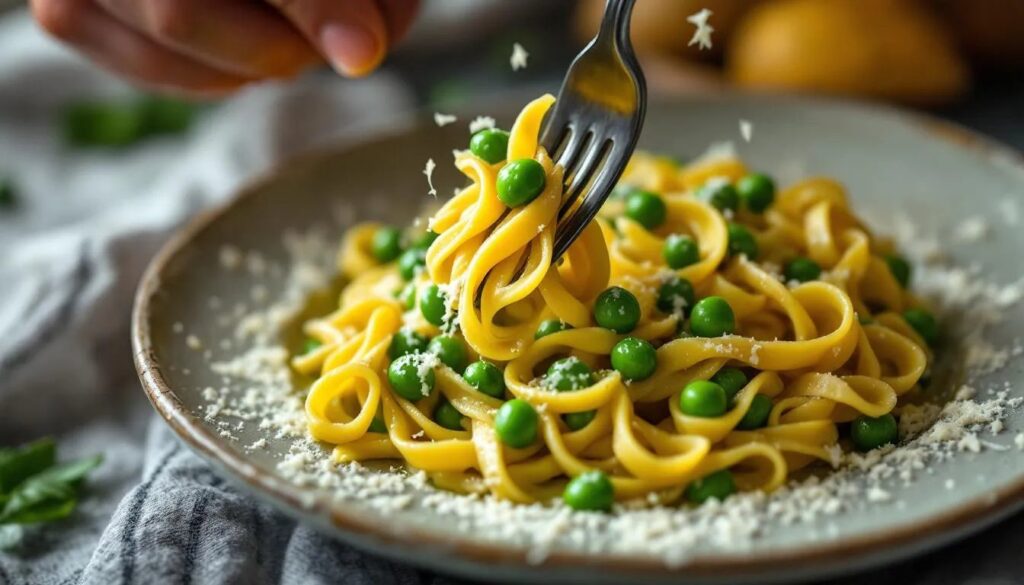 Questo è il gesto che fa la differenza. Quando i piselli sono cotti, prelevane circa un terzo con un mestolo forato e schiacciali grossolanamente con una forchetta o uno schiacciapatate, riducendoli a una purea rustica. Rimettili nella casseruola e mescola: questa tecnica semplice, che i napoletani usano istintivamente, libera l'amido naturale dei legumi e crea quella base cremosa e avvolgente che distingue la pasta e piselli napoletana da tutte le altre versioni.